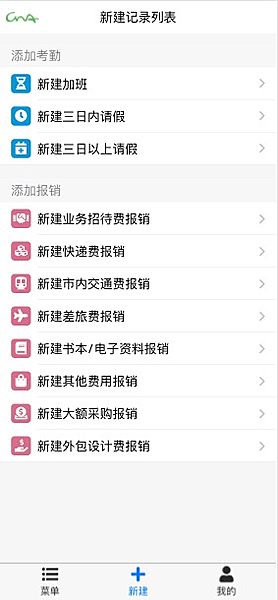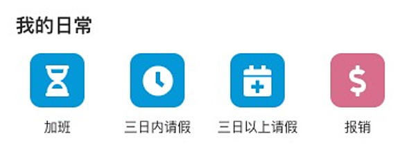 我的日常部分,点击图标可显示“我”新建的考勤与报销查询列表。