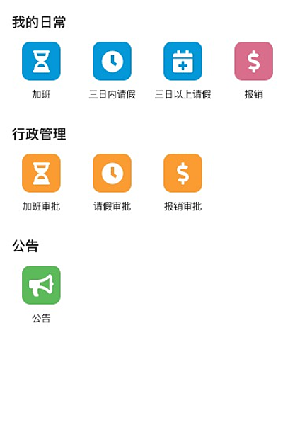 行政管理部分,点击图标可显示由我审批的考勤与报销查询列表。