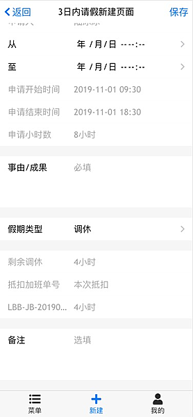 2)假期类型除事假、病假外,均会在下方显示可用假期时间,请根据可用假期时间填写。