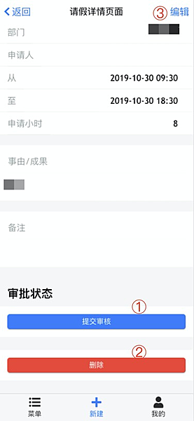 2)详情页中检查加班信息是否正确,如无误则点击“提交审核”进入审批;如有误则点击右上角编辑或在详情页最下方点击删除。